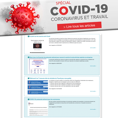 18 mars 2020Rubrique Spéciale Coronavirus et travailDès l'annonce du premier confinement, nous avons mis à disposition une rubrique spéciale Coronavirus et travail sur le site Entreprise & Santé, afin d'accéder rapidement aux dernières actualités et recommandations en vigueur.En savoir plus -