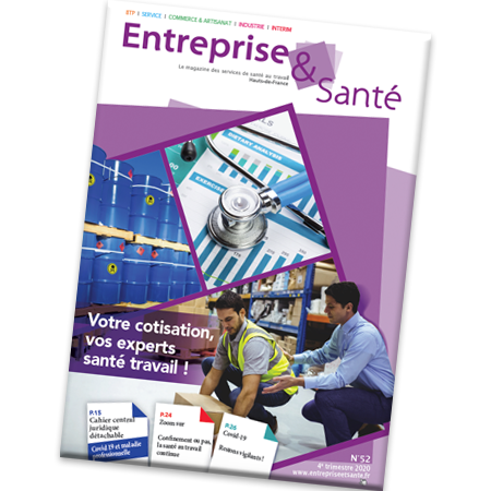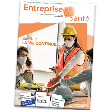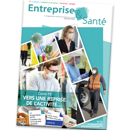 16 avril 2020Sortie du N°50 d'Entreprise & SantéLe dernier numéro du magazine Entreprise & Santé est sorti. Ce trimestre, nous avons réalisé un numéro spécial "Covid-19, vers une reprise de l'activité" avec le souci de vous apporter des conseils très concrets de prévention. Merci au Pr Paul Frimat pour l'interview accordée.En savoir plus -