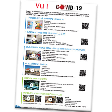 07 juillet 2020Covid-19 et reprise de l'activité: reportages au sein des entreprisesPendant la crise sanitaire, les services de santé au travail interentreprises sont restés présents au côté de leurs entreprises adhérentes, notamment pour les plans de continuité ou de reprise d’activité. Nous avons rencontrés 6 entreprises, reportages...Voir les reportages -