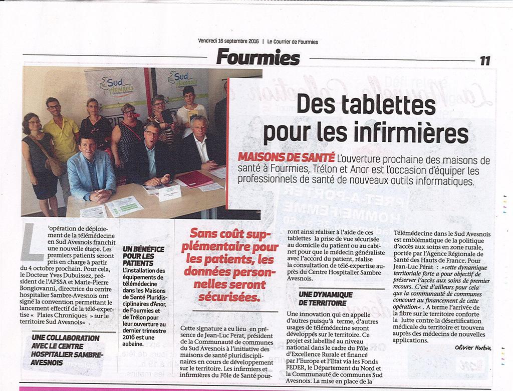 A cette occasion, infirmiers et infirmières du Pôle de Santé ont reçu des tablettes numériques financées grâce aux fonds FEDER alloués à l'Intercommunalité. Dans le cadre de la télé-expertise, ces tablettes permettront la prise de photos à domicile du patient, par les infirmiers ou les médecins généralistes. Ces photos seront ensuite jointes au dossier du patient pour être envoyées aux médecins spécialistes experts, exerçant au CHSA, via la plate-forme WebDCR. Médecins généralistes, infirmiers libéraux et experts du CHSA ont été formés en juin à l'utilisation de cette plate-forme.